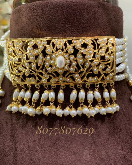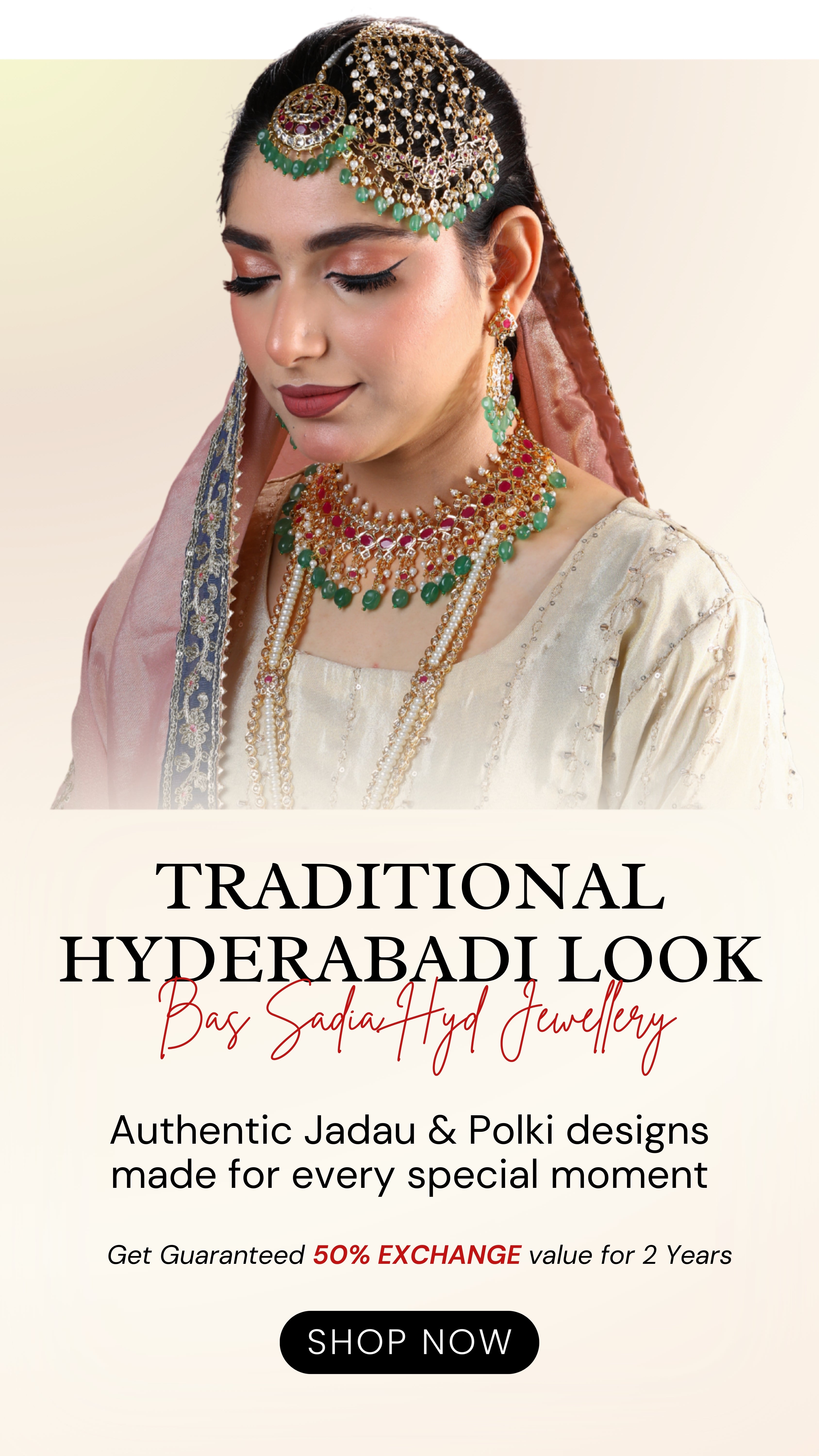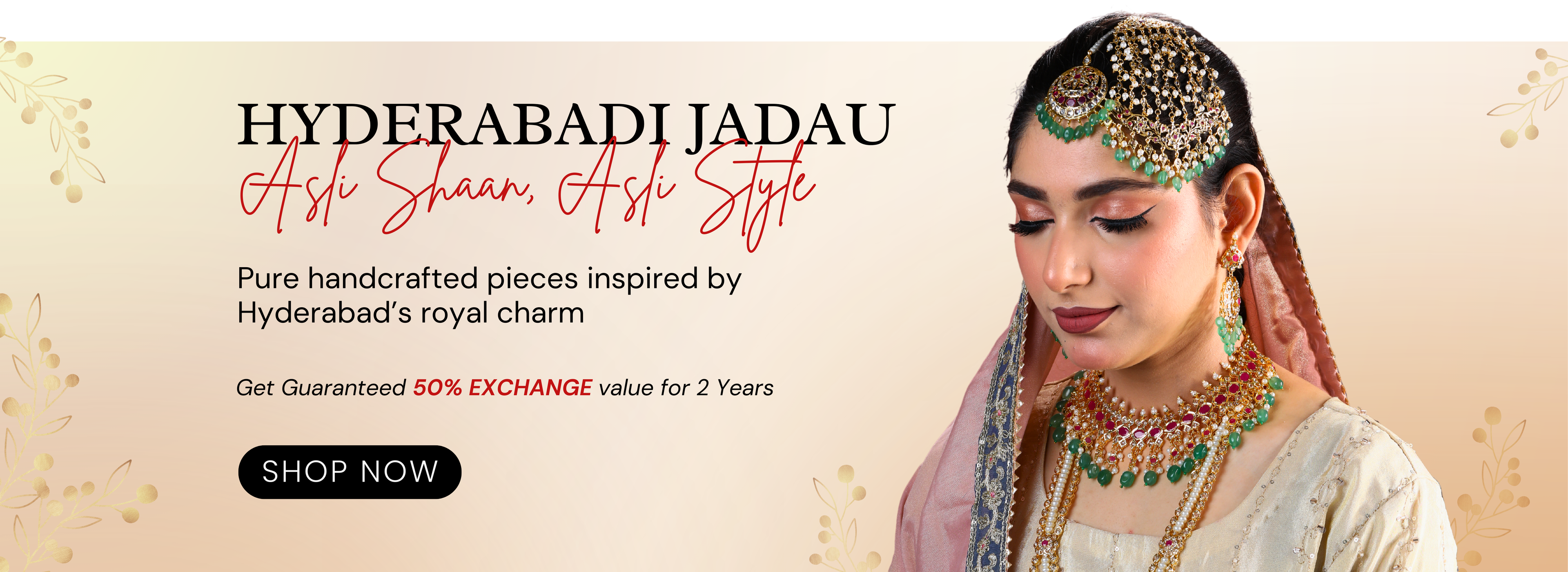 Our wide range includes Jadau Classics like Asif Jahan Haar, Hyderabadi bridal Jewellery Chandbali, Rani Haar, Satlada, Tika Jhumar Mathapatti, Real Pearl/Ruby/Emerald Jewellery, Jugni, Champakali, tirmani and more - each meticulously designed to preserve the legacy of pearl jewellery from Hyderabad.