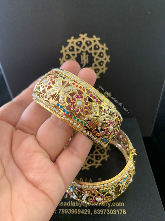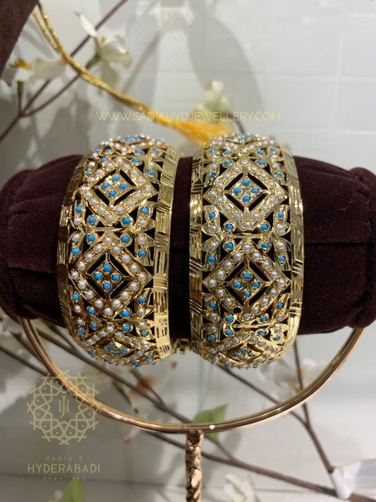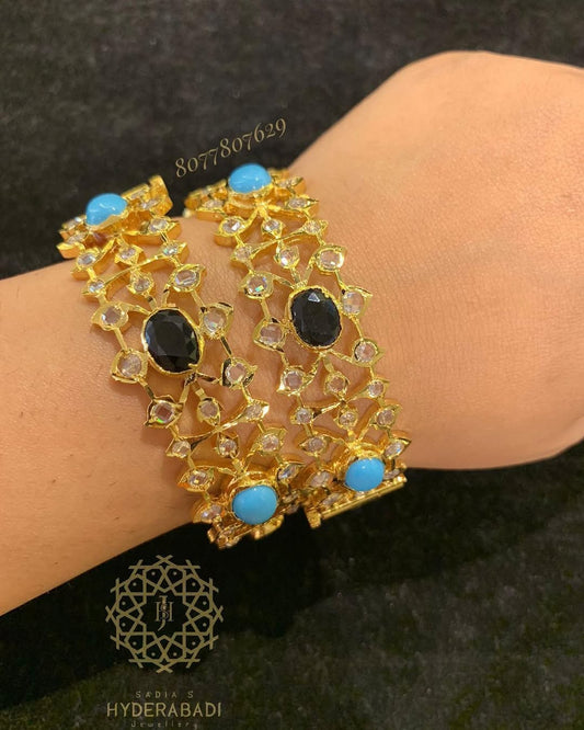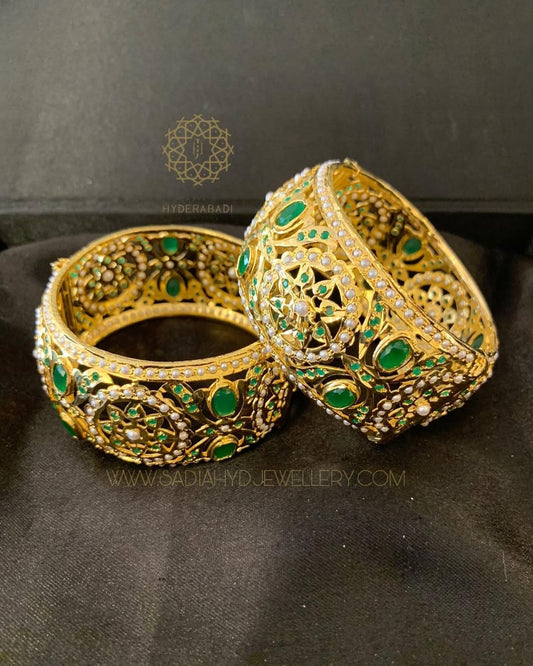 Treat yourself to our spectacular gold bangles for women that demonstrate the beauty of Hyderabad bangles! Our bangles are well made and quality materials reflect a beauty and durability that lasts a lifetime. Sadia's Hyderabadi Jewellery produces gold bangles for women perfect for traditional styles or modern minimalistic designs; we have something for every taste! Hyderabadi bangles are the best of artistry and truth rooted in the heritage of Nizami craft; Wear these masterpieces on your wrist and allow the bangles in Hyderabad to enhance your jewelry collection.