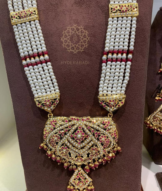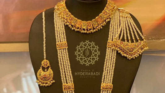 Our Bride wedding jwellery sets are handcrafted to the highest specifications and attention to detail. We use only excellent materials to ensure that each piece is strong and skin-friendly while remaining glistening for many years. The bridal jewellery set Pakistani designs are made with craftsmanship to look like real Nizami and Mughal art. Every Pakistani jewellery set we design has been through a rigorous quality check to ensure all elements are perfect because a bride’s day is one of beauty and perfection. At Sadia's Hyderabadi jewellery, you don’t just wear jewellery - you wear legacy and pride and emotion.