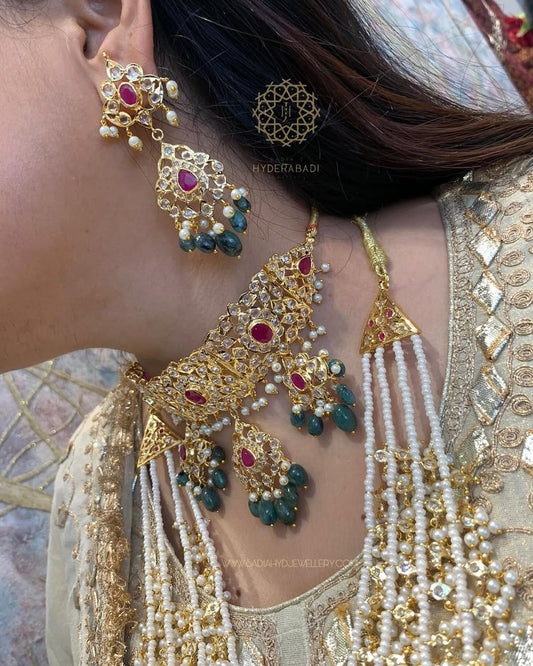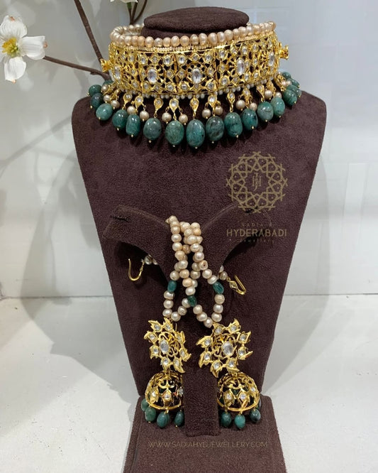 Mirha Real Emerald Real Pearl with Pukhraj Stone Fitting Bridal Set
