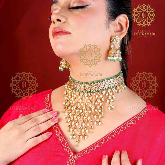 Explore the opulent universe of set chokers at Sadia's Hyderabadi Jewellery and discover the right piece that reflects your identity. Browse unique, handcrafted choker necklaces and choker sets that are sure to turn heads and elevate your style with a quality and timeless elegance. Whether you’re treating yourself or gifting to someone special, our set chokers are the perfect combination of elegancy and charm. Order online today and experience the luxury of handcrafted beauty today, with Sadia's Hyderabadi Hyd Jewellery. Each of our set chokers is a unique story of family history, craftsmanship, and beauty.