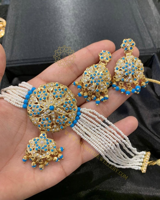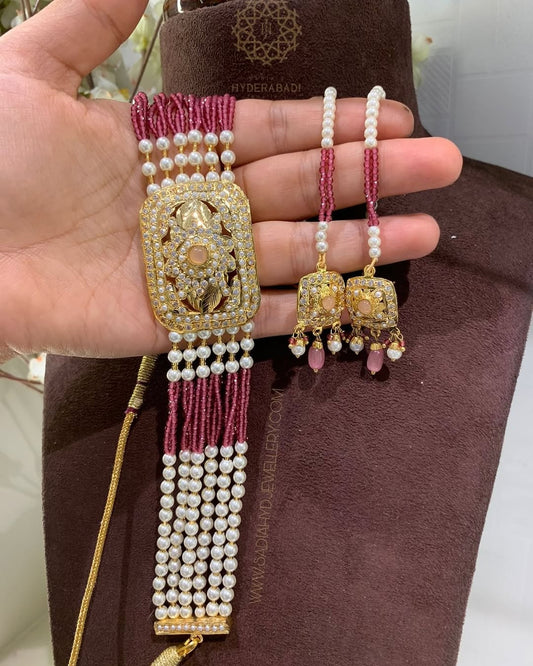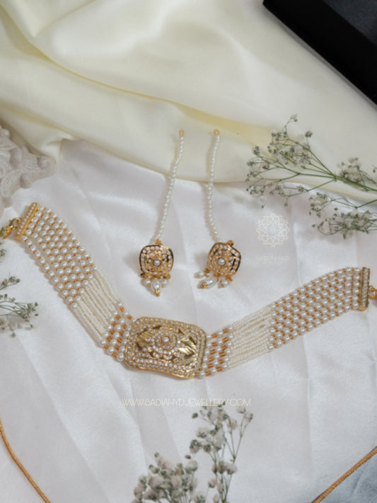 There is nothing more regal than the guluband gold necklace by Sadia's Hyderabadi Jewellery for a bride looking for palatial elegance. In our bridal collection, our guluband designs in gold complement traditional bridal attire exceptionally well. They are inspired by Nizami artistry and visualized for their range of richness weaved among the confines of sophistication. Pieces of Hyderabadi Guluband Jewellery are created to celebrate a bridal glow and feeling like royalty on her wedding day. Our guluband gold settings adorned with pearl, ruby, or emerald stones are collections that will become heirloom pieces for generations to come.