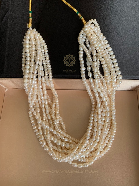 Our pearls necklace real collection demonstrates a wealth of knowledge about traditional/jewelry design and making. Each original pearl necklace set is crafted from carefully selected. premium quality pearls and exquisite detailing to create glare that lasts. Whether you like a single line or luxurious multiple layers look, our real pearl necklaces are made to emphasize and show off the luster and texture of the pearls. Complement your look by finishing it with a matching pearl set with pendant. At Sadia's Hyderabadi Jewellery we create pieces that can stand the test of time, characterized by elegance, gracefulness and authenticity.