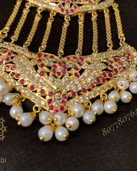 The jhumar for bride is a traditional South Asian piece of bridal attire that embodies propriety, prosperity, and feminine appeal. At Sadia's Hyderabadi Jewellery, we honor this Afghan tradition by offering beautiful jhumar jewellery pieces that illustrate centuries,or even millennia', work of traditional craftsmanship. Each jewellery jhumar is handcrafted by artisans who pay a great deal of attention to detail by using good quality materials to ensure the jhumar for bride looks suitable and enhances every bridal look you create. Whether it is used with a mathapatti, maang tikka, or just on its own, the jhumar for bride makes an instant transformation delivering a sense of regal royalty to your attire in true homage to Hyderabadi royalty.