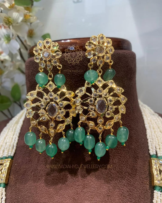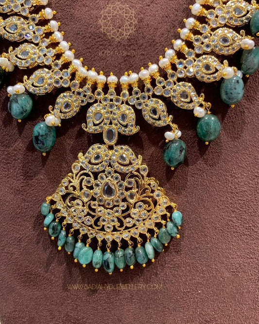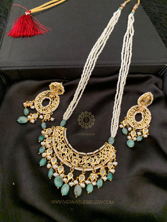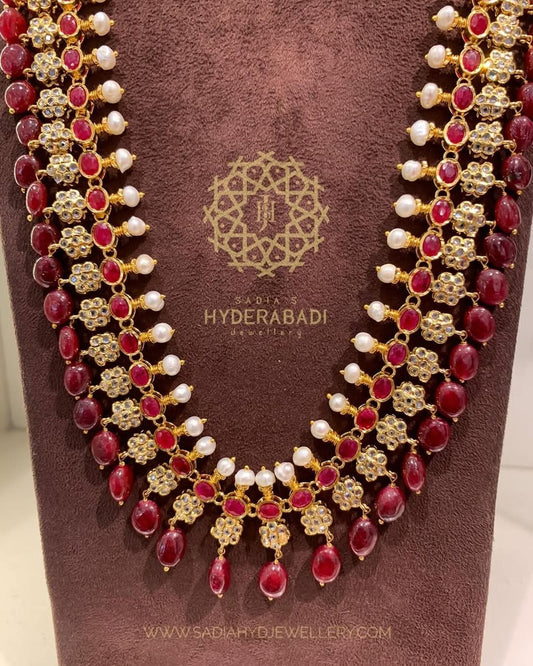 Experience the regal style with pearl rani haar designs from Sadia’s Hyderabadi Jewellery. Each pearl rani haar is a representation of elegance, luxury, and sophistication influenced by the splendour of the Nizami traditions. Handcrafted with great care, our collection incorporates lustrous pearls and intricate detailing capturing the origin of Hyderabad’s royal heritage. Whether you’re getting ready for a wedding, a festive celebration or a royal event, our rani haar necklace collection will add timeless style to your aesthetic. Our pearl rani haar collection has something for all occasions, with elegant artificial rani haar pieces that were created to coordinate with any outfit, for women who appreciate the balance of tradition and contemporary styles.