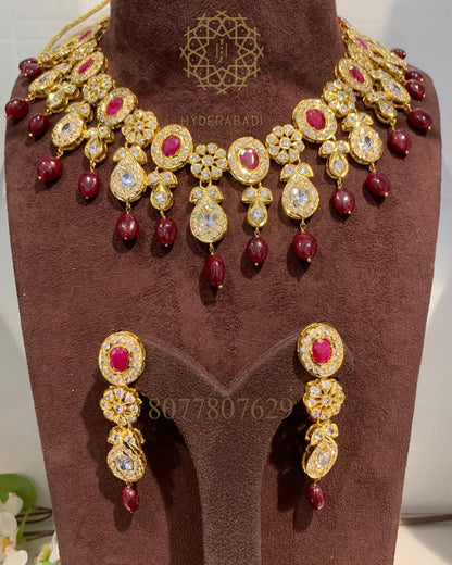 The Tarab Real Ruby Real Pearl Necklace Set is a captivating and luxurious jewelry ensemble plated with 22k gold. The necklace showcases genuine ruby gemstones, radiating a rich red hue, elegantly paired with lustrous real pearls. The intricate design and meticulous craftsmanship of the necklace and matching earrings exude a perfect blend of opulence and elegance, ideal for enhancing special occasions.