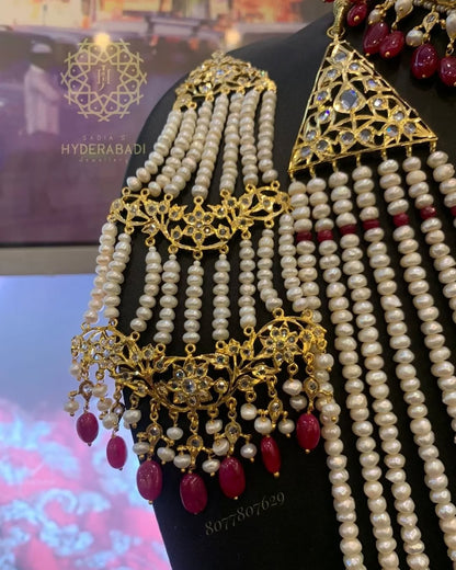 22k Gold Plated Asra Real Ruby with Real Pearls Complete Bridal Set. One of the best Choice for the Brides and Bride to be's. This a booster for Self Confidence for all the beautiful brides out there. One of the most Appealing design from Sadia's Hyderabadi Jewellery. Made with the best Quality of Real Ruby and Real Pearls. Hurry and Order Now !!