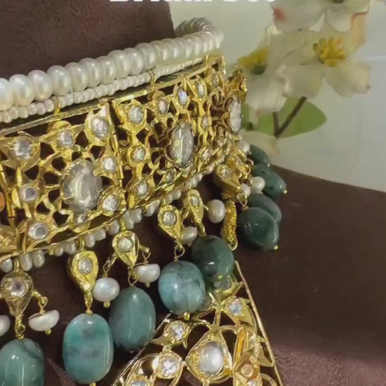 This Bridal Set is a stunning and elegant jewelry piece plated with 22k gold. It showcases a beautiful combination of Light Green Stone and pearl, creating a classic and timeless look. The intricately designed set exudes sophistication and charm, making it a perfect accessory to enhance any outfit with a touch of grace and beauty for special occasions or daily wear.