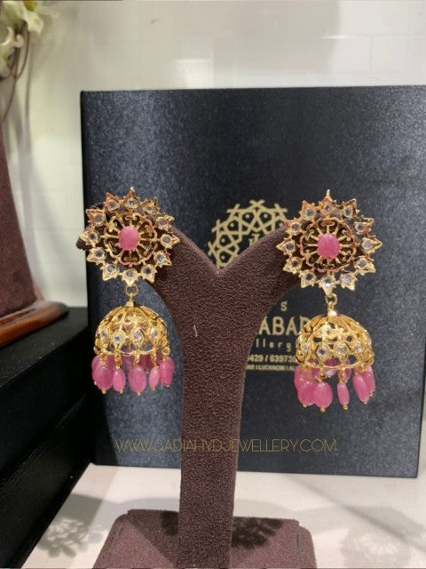 This Light Pink Real Ruby Jhumki is a stunning and elegant jewelry piece plated with 22k gold. It showcases a beautiful combination of Pearl and Ruby Stone, creating a classic and timeless look. The intricately designed set exudes sophistication and charm, making it a perfect accessory to enhance any outfit with a touch of grace and beauty for special occasions or daily wear.